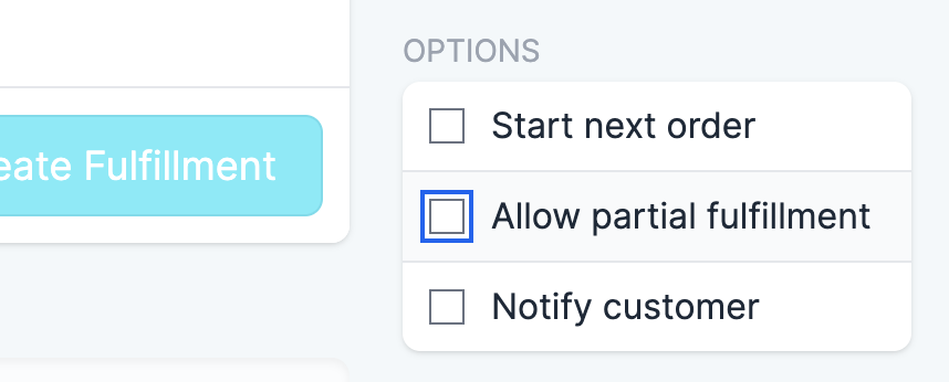 When scanning items, to partially ship an order, click the drop-down menu to the right of the “Fulfill Items” button. Select the “Allow partial fulfillment” checkbox to enable partial shipping: