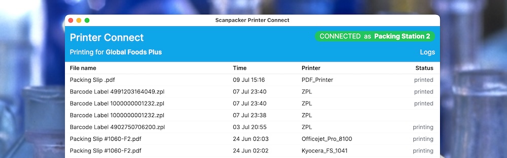 Scanpacker Printer Connect is a desktop application that connects your Scan to Ship account to your physical printers. The application receives print jobs from your Scan to Ship account and sends them directly to your physical printers. Printer Connect supports both regular and thermal label printers.